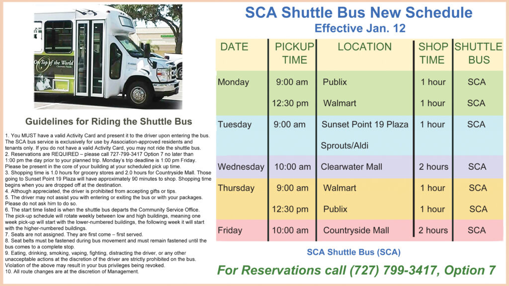 On Top of the World Bus Service: Free service to local shopping centers to all On Top of the World residents. Schedules and pick-up points are listed in the On Top of the World newspaper and this website.